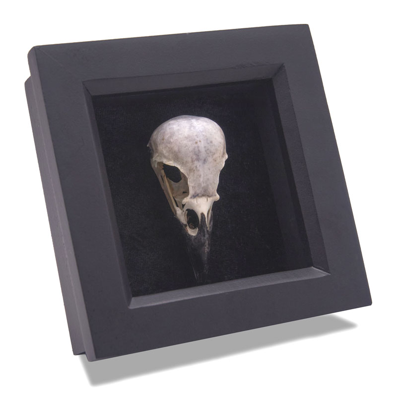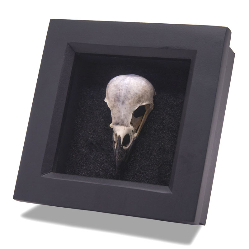 A UK sourced real Eurasian Magpie skull (Coloeus monedula). The skull is tastefully mounted in a handmade recessed matt black wooden frame with black velvet background. The complete adult skull has no holes or cracks. Frame approximately 115mm square (4.5in). Preserved in its natural state, the skull been cleaned in soapy water and dried out with zero odours. The item shown is an example of what will be supplied.